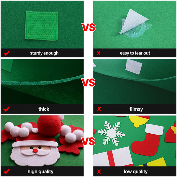 Izrađeni su od istog debelog, visokokvalitetnog filca. Pričvršćuju se ušivenim čičak trakama (za razliku od jeftinijih koje su samo zalijepljene). Primjeri uključuju zvončiće, poklone, snjegovića, lizalicu i pahuljice. Drvce ima zvijezdu za vrh i deblo za dno. Čičak je ušiven na drvce kako bi oba dijela čvrsto stajala.