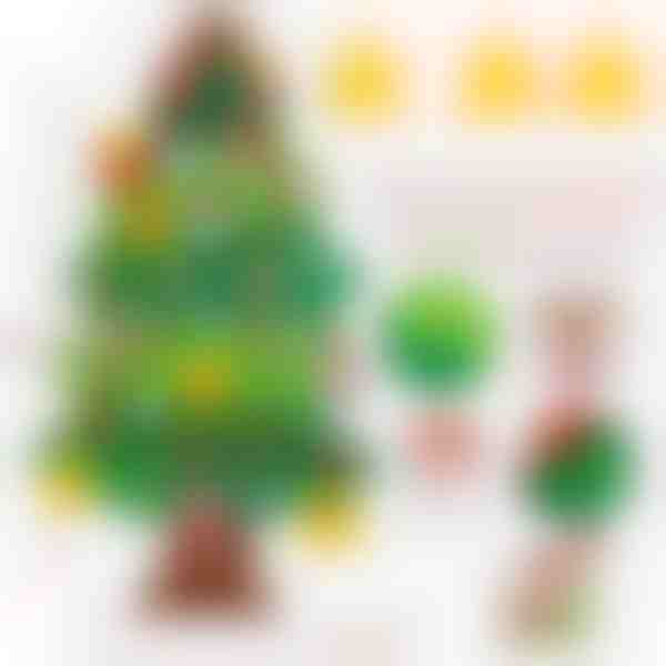 Izrađeni su od istog debelog, visokokvalitetnog filca. Pričvršćuju se ušivenim čičak trakama (za razliku od jeftinijih koje su samo zalijepljene). Primjeri uključuju zvončiće, poklone, snjegovića, lizalicu i pahuljice. Drvce ima zvijezdu za vrh i deblo za dno. Čičak je ušiven na drvce kako bi oba dijela čvrsto stajala.