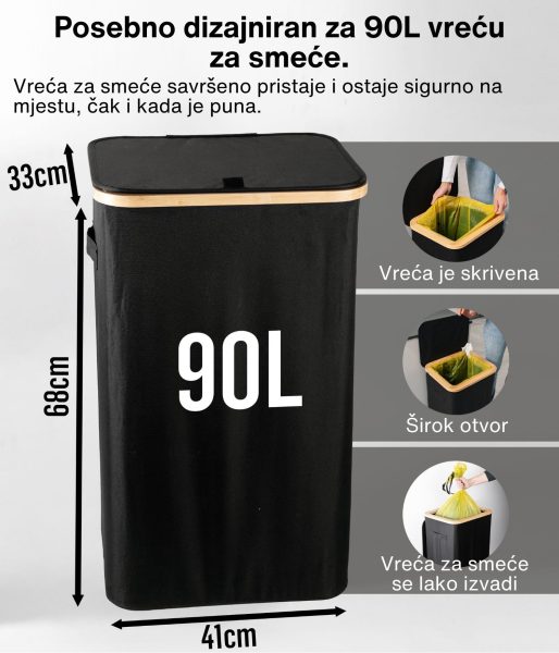 Ovaj se model može pohvaliti ojačanim šavovima, izdržljivim materijalima i estetski ugodnom crnom bojom koja se bez napora uklapa u svaki prostor – bilo da se radi o modernom uredu ili minimalističkoj kuhinji. Njegov kompaktan, ali prostran dizajn omogućuje učinkovito recikliranje bez zauzimanja previše prostora. Osim toga, kanta je opremljena okvirom od bambusa sa željeznim prstenom na koji je pričvršćena vreća za smeće, što olakšava mijenjanje i korištenje. Kanta je predviđena za vreće za smeće od 90 l, ali lako možete koristiti i veće.