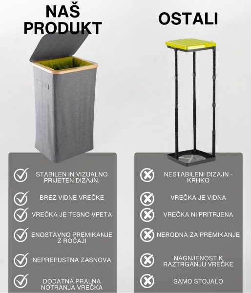 - INOVATIVAN DIZAJN: naš patentirani okvir od bambusa s metalnim prstenom čvrsto drži vreću za smeće na mjestu i sprječava njeno spuštanje. Presvlaka od tkanine diskretno skriva otpad i pomaže u zadržavanju neugodnih mirisa.