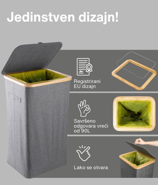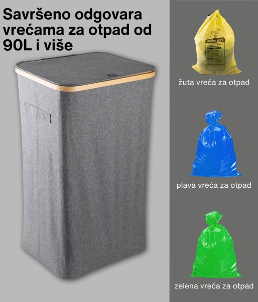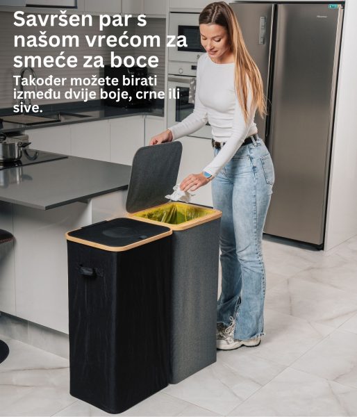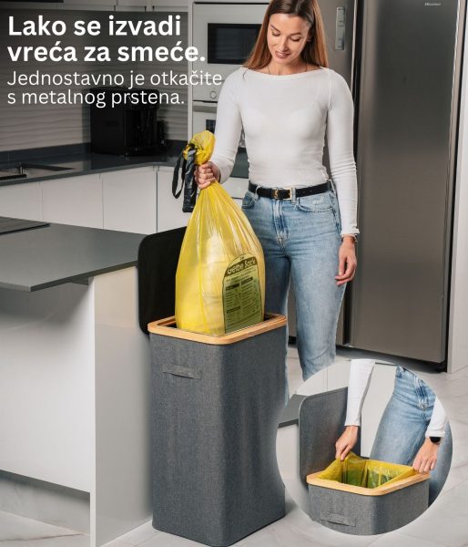 Ovaj se model može pohvaliti ojačanim šavovima, izdržljivim materijalima i estetski ugodnom sivom bojom koja se bez napora uklapa u svaki prostor – bilo da se radi o modernom uredu ili minimalističkoj kuhinji. Njegov kompaktan, ali prostran dizajn omogućuje učinkovito recikliranje bez zauzimanja previše prostora. Osim toga, kanta je opremljena okvirom od bambusa sa željeznim prstenom na koji je pričvršćena vreća za smeće, što olakšava mijenjanje i korištenje. Kanta je predviđena za vreće za smeće od 90 l, ali lako možete koristiti i veće.