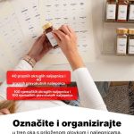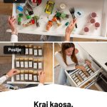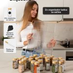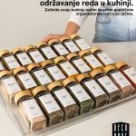 - UNESITE RED U SVOJU KUHINJU – Ovaj komplet uključuje dva organizatora ladica, 24 staklenke za začine, 280 bijelih naljepnica, četkicu, dva posipača i lijevak.