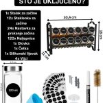 Ovaj komplet sadrži stalak za začine, samoljepljive podloge, 12 staklenki, 48 etiketa, kist, kredni marker, dva posipača, lijevak i materijal za montažu.