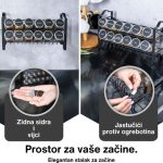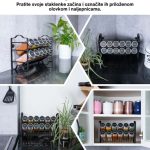 Izdržljiv i svestran stalak Naš stalak izrađen je od čvrstog metala. Okvir može nositi potpuno napunjene staklenke s začinima. Također je otporan na hrđu i koroziju. Komplet sadrži i dodatke koji omogućuju fleksibilno korištenje stalkа. Postavite ga na pult ili ga pričvrstite vijcima na zid kako biste uštedjeli prostor.