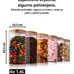 Komplet od 6 staklenih posuda za pohranu za višekratnu upotrebu s poklopcem od bambusa – Hermetički zatvorene, prikladne za perilicu posuđa ili mikrovalnu pećnicu – Posuda za kolačiće, tjesteninu, suhu hranu, žitarice, kavu – 20 cm visine, 10 cm širine