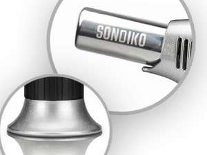 The safety lock prevents accidental ignition. The wide base keeps it from tipping over. The long angled nozzle and burn guard protect your fingers by keeping your hand safely away from the flame. Our culinary torch is made from professional-grade materials to provide a safe and easy-to-use tool.