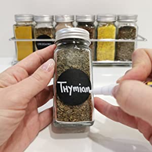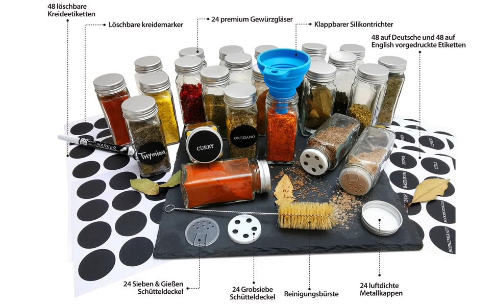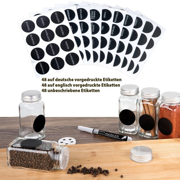 Ne samo da dobivate 24 izvrsne staklenke za začine, već i komplet koji vam pruža sve što vam je potrebno. Uključeno je 48 unaprijed ispisanih okruglih naljepnica s nazivima začina na njemačkom, 48 unaprijed ispisanih okruglih naljepnica s nazivima začina na engleskom i 48 praznih okruglih naljepnica na kojima možete sami pisati vrlo kvalitetnom olovkom s kredom koja je također uključena.