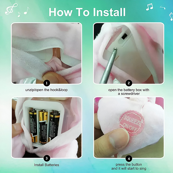 Odjeljku za baterije možete lako pristupiti kroz otvor na čičak na stražnjoj strani igračke. Okrenite prekidač na “ON” i magija počinje. Izrađen od visokokvalitetnih materijala, Roxy je mekan, izdržljiv i siguran za djecu.