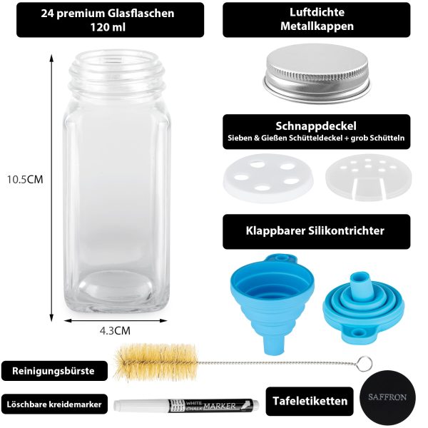 Komplet od 12 staklenke za začine Deco Haus s poklopcem na navoj – Komplet za začine s naljepnicama, lijevkom, četkom za čišćenje, olovkom – Odgovara našim 2 zidnim policama za začine – Prazne staklene posude za pohranu i dozator 120 ml, 10,5 x 4,3 cm