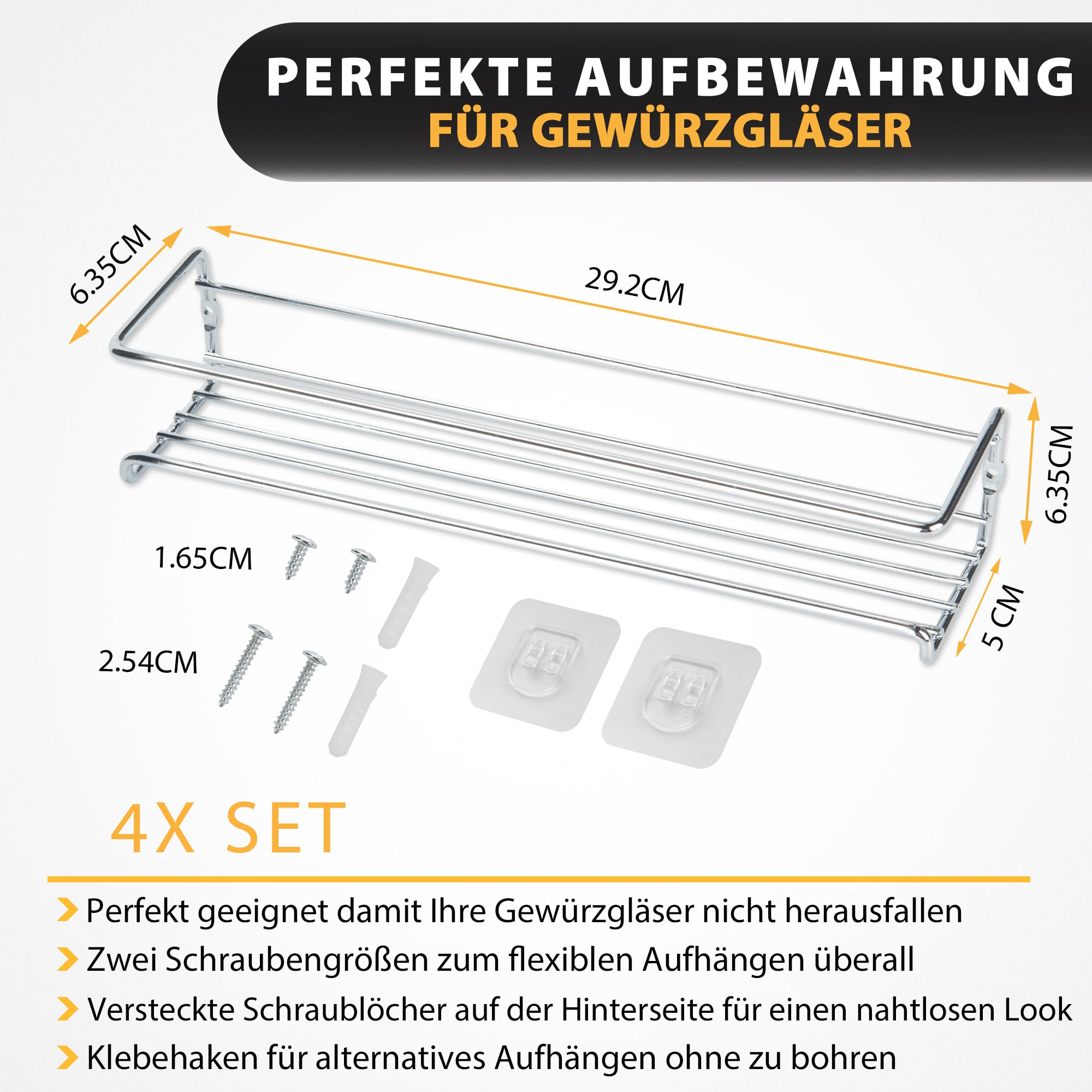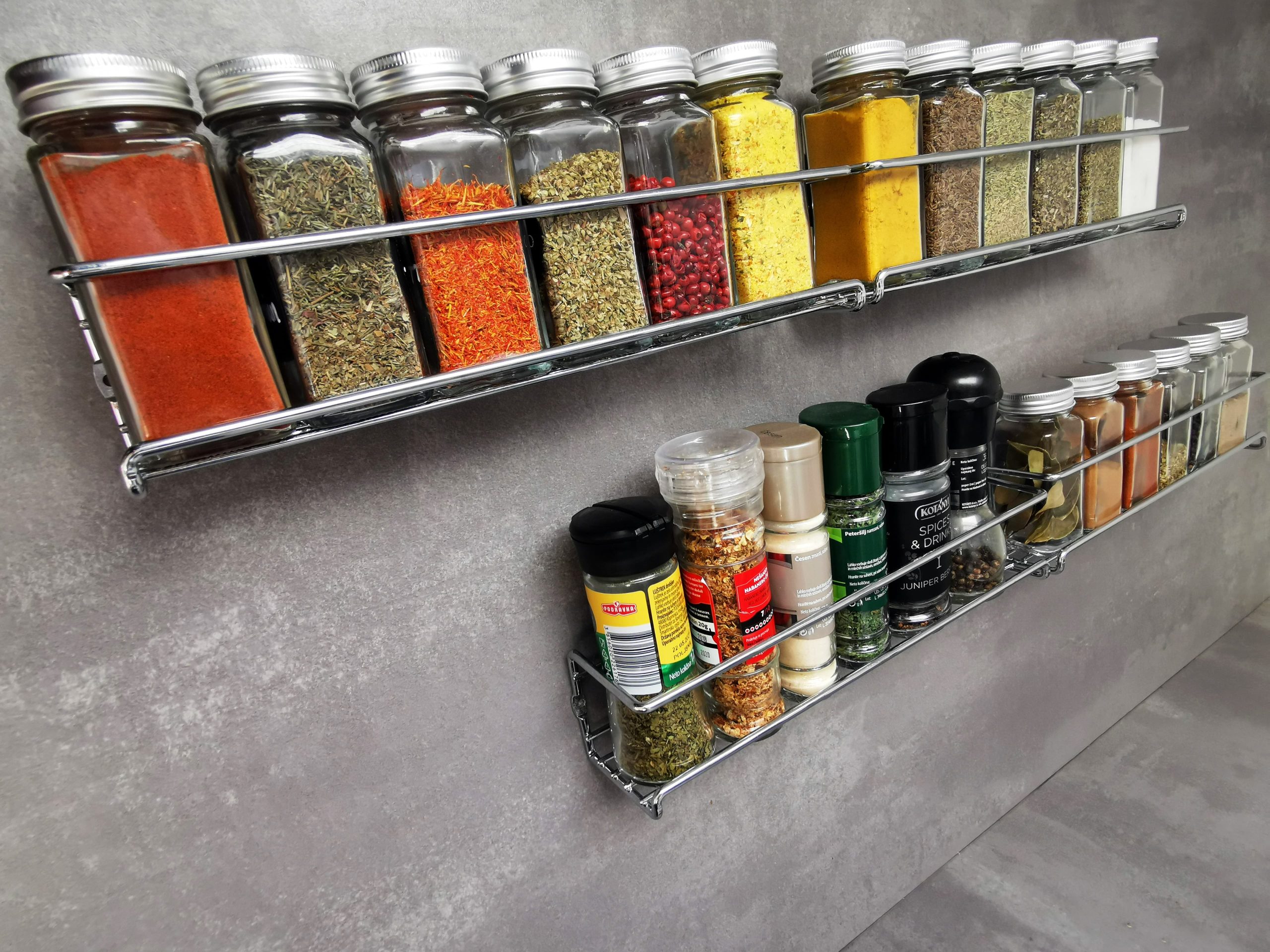 Naše police za začine izrađene su od čvrstog metala i sigurno će osigurati prostor za sve vaše omiljene začine! S duljinom od 29 cm, visinom od 7 cm i dubinom od 7 cm (od kojih se 5 cm može upotrijebiti), polica odgovara svim standardnim posudama za začine, održava ih organiziranima i nadohvat ruke.
