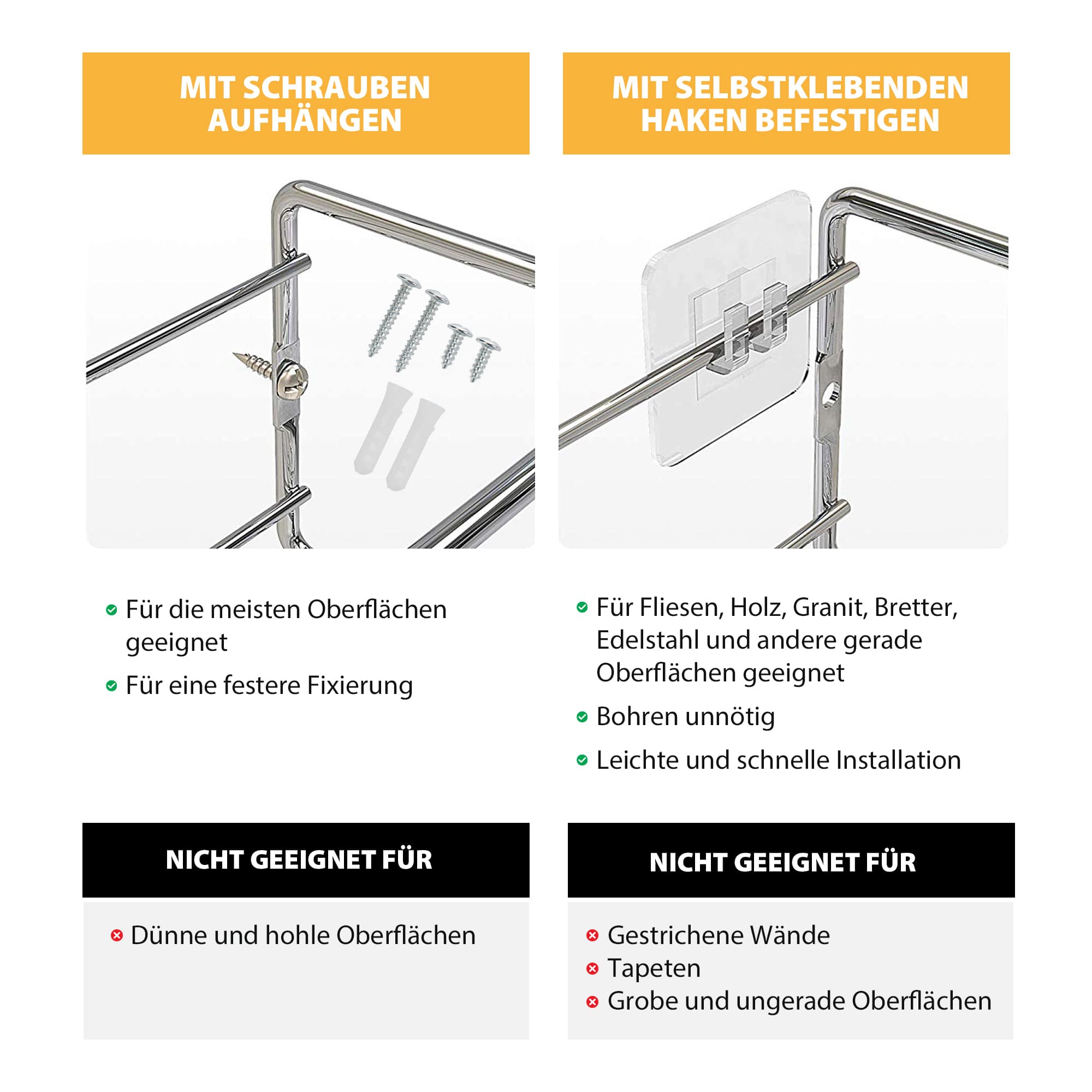 ✅ JEDNOSTAVNO SASTAVLJANJE – Za postavljanje ovih metalnih polica za začine možete upotrijebiti isporučene tiple i vijke ili ih jednostavno postavite s pomoću priloženih ljepljivih jastučića. Izbor je vaš!