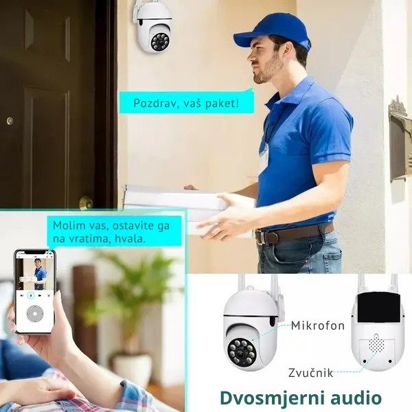 Ugrađeni responzivni mikrofon na vanjskoj sigurnosnoj kameri, zahvaljujući kojemu možete slušati i razgovarati putem naše aplikacije. Dvosmjerni zvuk omogućuje komunikaciju s prijateljima, a alarmom za otkrivanje pokreta možete se riješiti neželjenih gostiju ili životinja.